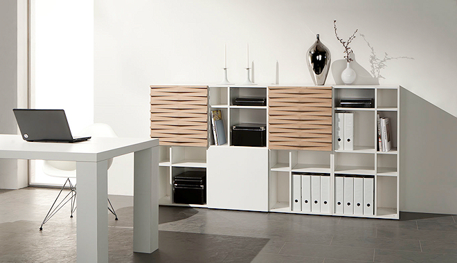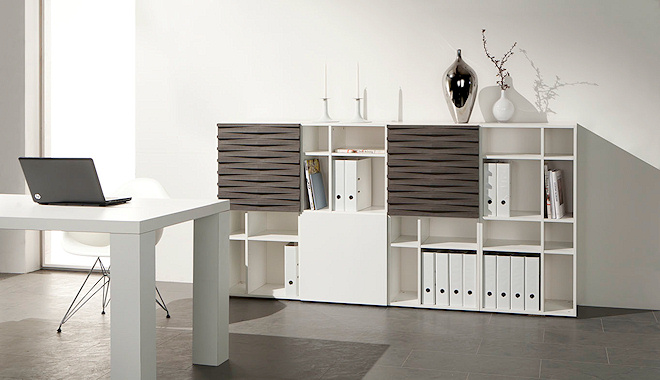 Das Büro mit Design-Anspruch. Die ungewöhnliche Relief-Front und die asymmetrische Anordnung der Türen verleihen der Regalwand das besondere Etwas.