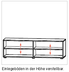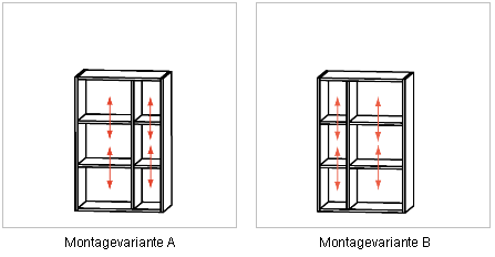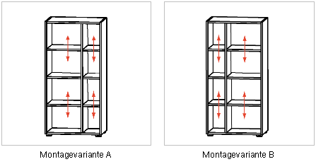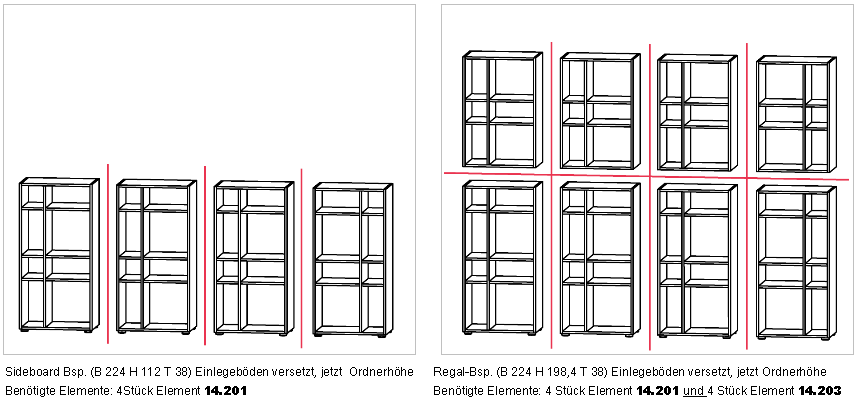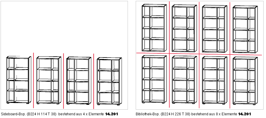 Ein Element mit zwei Optiken. Bestellen Sie ein oder mehrere Grund- und Aufsatzelemente Code 14.201 und entscheiden Sie erst bei der Montage, wie das Erscheinungsbild sein soll…die schmalen Fächer links oder rechts – Sie haben die Wahl. Um Ihr Möbel zu einem Unikat zu machen oder um einfach nur die passenden Fächer für Ihre Bücher und Bildbänder zu haben, können Sie die Einlegböden, die mit roten Pfeilen markiert sind, dank der durchgehenden Lochreihe bequem in der Höhe verstellen. Damit die Grund- und Aufbauelemente immer einen festen Stand haben, werden sie mit 4 höhenjustierbaren Stellfüßen (Höhe 2-3 cm) geliefert, um gegebene Bodenunebenheiten ausgleichen zu können. Mit dem Grund- und Aufsatzelement bauen Sie sich ganz einfach Ihre Wohnwand. Setzen Sie einfach mehrere Elemente nebeneinander und schon haben Sie ein Sideboard oder eine höhere Variante gefällig? Setzen Sie eine zweite Reihe oben drauf und Ihre Bibliothek ist komplett. (Zur besseren Orientierung sind die einzelnen Elemente in den Skizzen mit Abstand dargestellt).