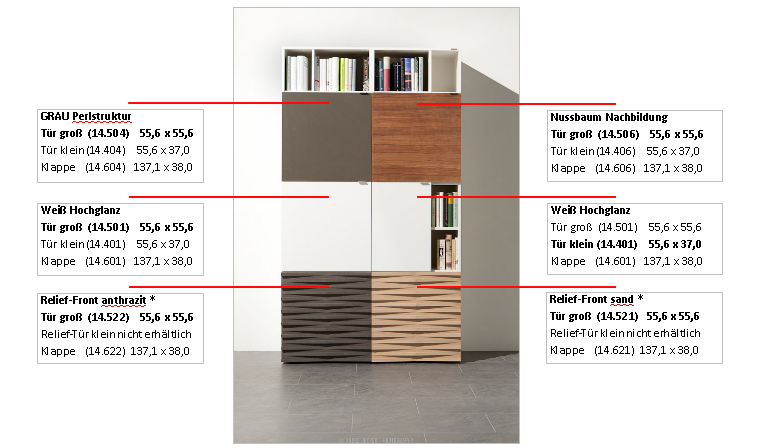 Auf dem TV-Bank-Element können Sie Ihr TV-Gerät perfekt positionieren und dazu noch Ihre Hifi-Geräte in dem Element ganz leicht unterbringen. Durch die gegenüber den anderen Elementen höhere Tiefe des TV-Bank-Elements gewinnt Ihre Wohnwand zusätzlich an Dynamik. Aus statischen Gründen ist ein Stapeln von TV-Bank-Elementen nicht möglich. Türen / Klappen Folgende Tür- & Klappenvarianten sind erhältlich: Um verdeckten Stauraum zu schaffen können Sie eine oder mehrere Türen in Ihre One4x Zusammenstellung einbauen. Die Breite Tür (55,6 x 55,6) sowie die schmale Tür (55,6 x 37,0) sind nur in den Elementen Code 14.201 und Code 14.203 einsetzbar. Die Klappe (137,1 x 38,0) ist nur in das TV-Bank- Element Code 14.205 einsetzbar.