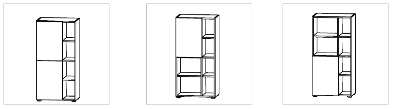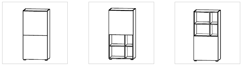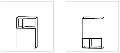 Dieses Element können Sie nur als Aufsatzelement auf das Element Code 14.203 setzen und nicht direkt auf den Boden stellen. Auch bei diesem Element müssen Sie erst beim Aufbau entscheiden, wo die schmalen Fächer angeordnet sein sollen – links oder rechts. Die Einlegeböden sind höhenverstellbar um sich optimal Ihren Büchern oder Vasen anzupassen (Zur besseren Orientierung sind die einzelnen Elemente in den Skizzen mit Abstand dargestellt).