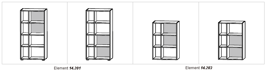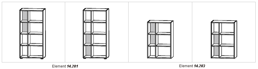 Element 14.201 mit einer oder zwei schmalen Türen bestückbar. Spiegelverkehrter Aufbau der Inneneinteilung des Elements ebenfalls möglich. Aufsatzelement Code 14.203 (B 56 H 84,4 T 38).